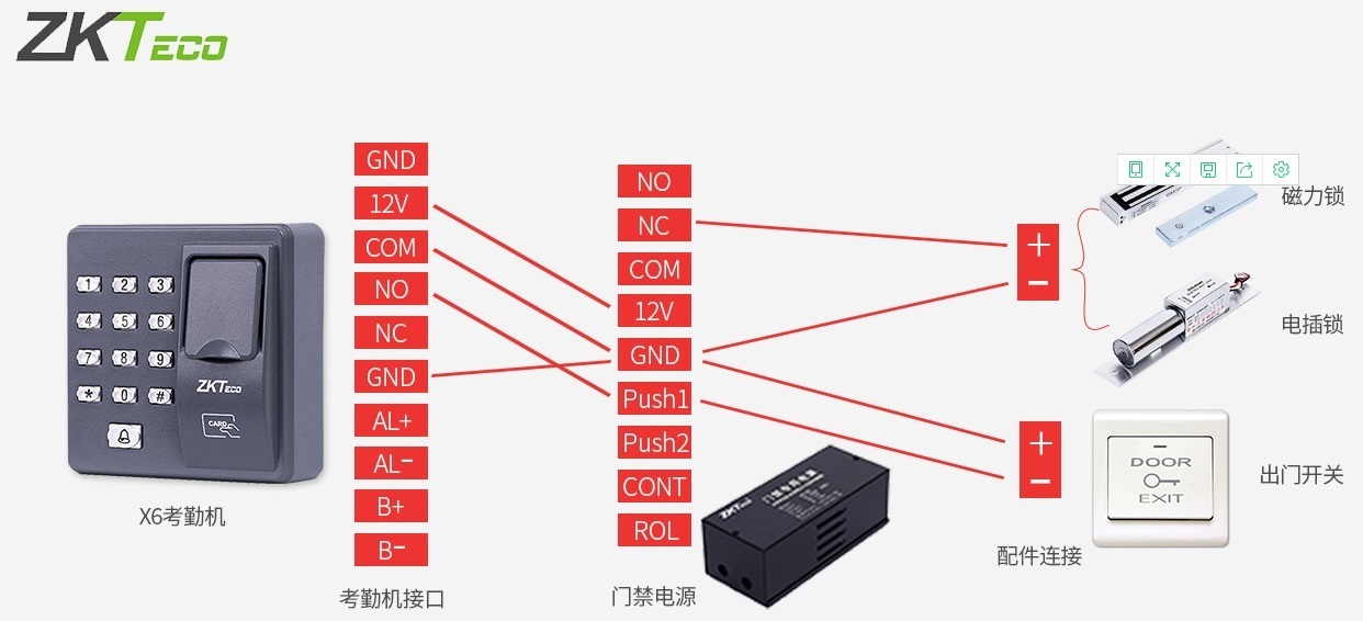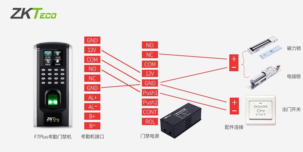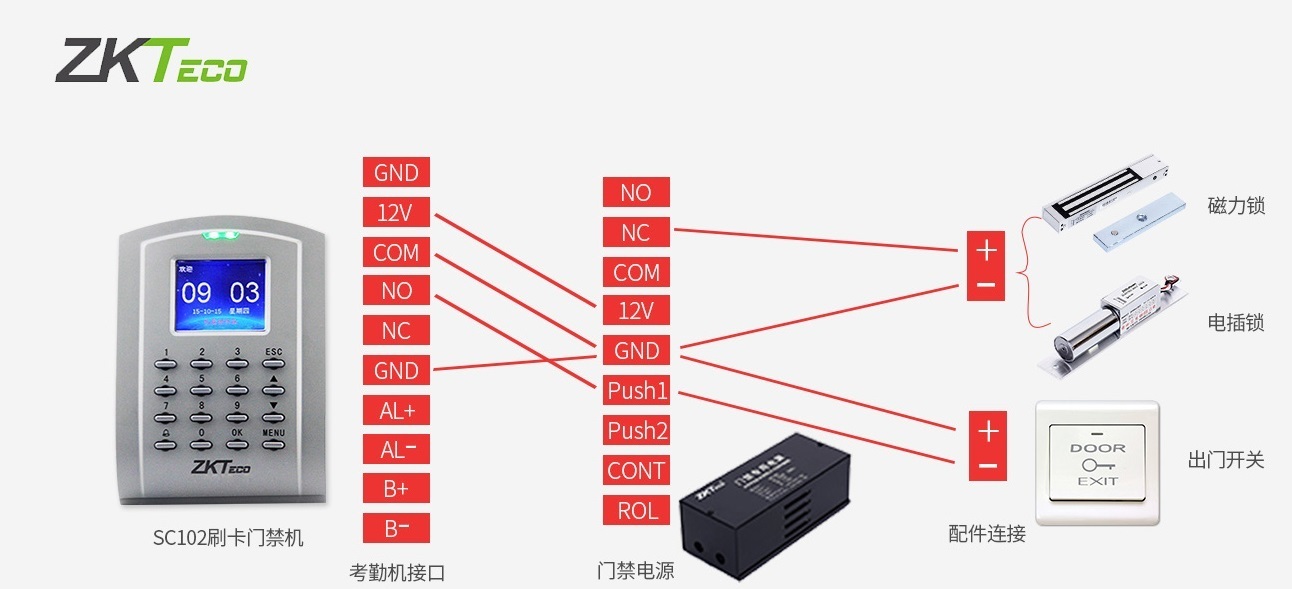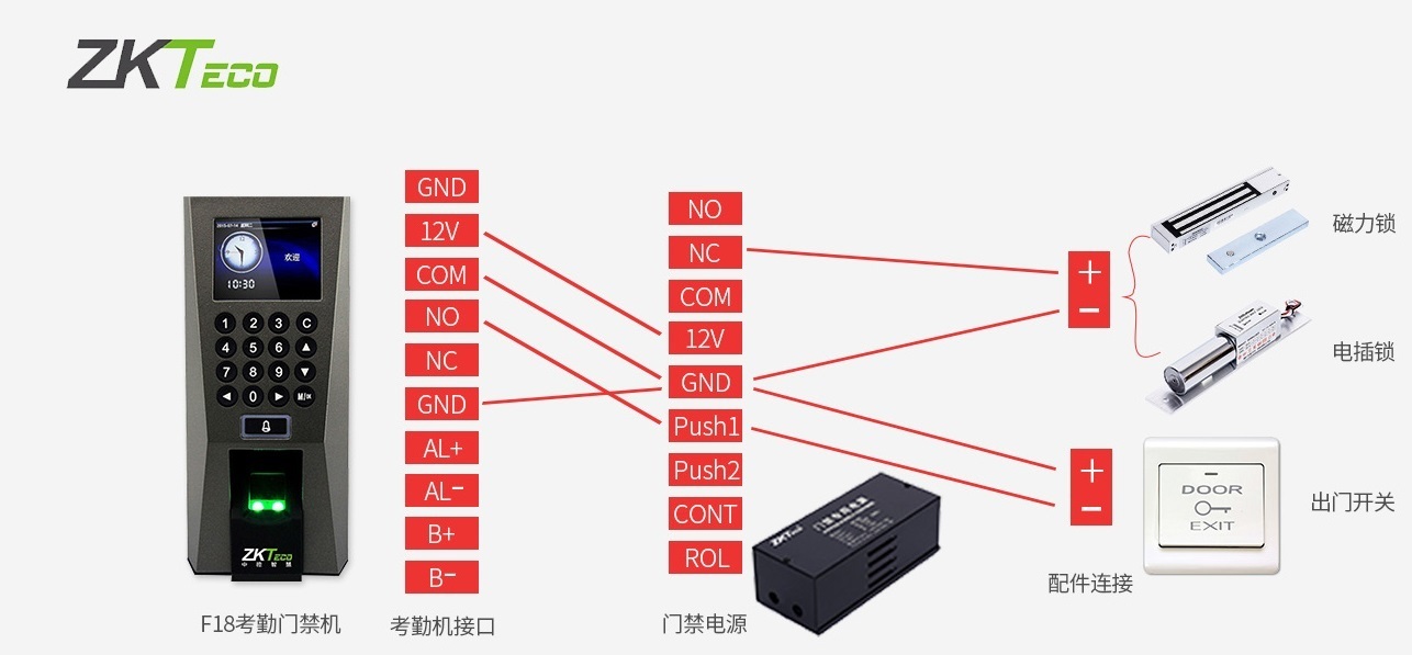 大型聯網門禁系統接線方法:門禁考勤一體機:GND:接地(接門禁電源的GND);12V:接電源門禁電源的12V,為門禁主機提供12V的電壓;COM:公共端;NO:通電上鎖(接門禁電源的PUSH);NC:斷電開鎖,AL+:警報器正極;AL-:警報器負極;BUT:按鈕;B+:門鈴正極;B-:門鈴負極。